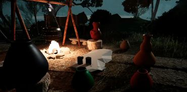 Participant stories are contained in large pots called “Story-pots”. These are scattered across a dreamy, mystical landscape. The landscape is built to be an engaging meditative experience. Players are encouraged to explore and will invariably find pots. Every pot has a rhythm that can be heard softly from a distance. As the player gets closer to a pot the music coming from it gets louder. Once found, pots can be taken to the Ancestor’s Whispering Forge where they are placed, and the story can be release.